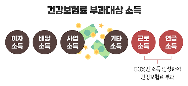 지역건강보험료 부과대상 소득으로는 이자·배당·사업·기타소득과 근로·연금소득이 있습니다. 이중 근로소득과 연금소득은 50%를 반영하고 나머지 소득은 100%를 반영한 금액으로 계산합니다.