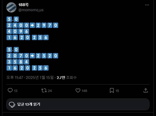 X에서 활동하는 188호(@momomo_us)는 짤막한 글을 남겼습니다. 내용에서 다분히 라데온 RX 9070 XT와 9070에 대해 유추할 수 있었죠. 정보는 이렇습니다. 하나는 ▲5.0 ▲2400→2970 ▲4096 ▲1620 ▲256 이고요. 다른 하나는 ▲5.0 ▲2070→2520 ▲3584 ▲1620 ▲256 입니다. 감이 오시나요?