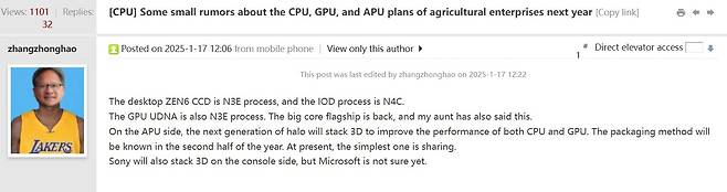 Chiphell에서 활동하는 Zhanzhonghao는 흥미로운 루머를 언급했습니다. 얼마나 흥미로웠으면 팁스터 HXL(@9550pro)가 퍼나를 정도입니다. 내용을 보면 차기 아키텍처 Zen 6가 적용될 메두사 릿지(Medusa Ridge)에는 TSMC의 N3E 공정이 적용된다고 하네요. I/O 다이는 TSMC N4P 공정에서 만들어질 예정이라고 언급됐습니다. 전반적인 구조 개선이 이뤄진다면 라이젠 프로세서의 성능 향상이 더 가파를 것으로 전망됩니다.