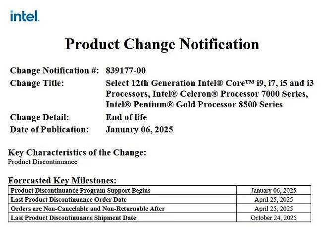 2025년 1월 초에 공개된 인텔 제품 변경 알림 문서에는 12세대 인텔 코어 i5, i7, i9 및 셀러론, 펜티엄 등에 대한 수명 종료 내용이 적혀 있었다고 합니다. EOL(End of Life)은 곧 단종할 예정이니 마음의 준비를 하고 주문을 하라는 의미의 문서입니다. 거의 대부분의 노트북용 12세대 코어 프로세서가 포함되어 있네요. 프로세서에 따라 최종 주문은 2025년 4월 11일부터 25일까지 가능합니다. 하지만 HX 프로세서만 예외라서 눈길을 끕니다. 그 외 프로세서의 최종 배송일은 2025년 10월 24일 혹은 2026년 1월 23일이네요.