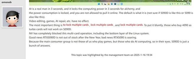 Chiphell에서 활동하는 omonob는 이에 대해 언급했는데요. 루머일 것 같지만 비교적 신빙성이 높아 보입니다. 일단 사양은 동일하지만, 인공지능 추론 또는 가상화폐 채굴이 감지되면 성능이 제한되는 구조일 것이라고 합니다. 과거 지포스 RTX 30 시리즈가 나오면서 등장했던 LHR(Lite Hash Rate)과 비슷한 느낌을 줍니다. 특정 부하가 3초 이상 인지되면 성능을 제한하는 식이라고 하네요. 이렇게 하면 기존 3362 AI TOPS가 2375 AI TOPS로 저하됩니다. 또한 지포스 RTX 5090D는 멀티 GPU 구성이 제한될 것이라고 하네요. 단일 GPU 구성만 지원한다는 이야기입니다. 구성이 조금 애매할 것 같네요.
