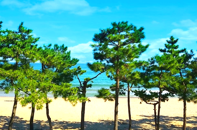 백사장 뒤편엔 소나무 숲, 바다 앞엔 작은 섬들