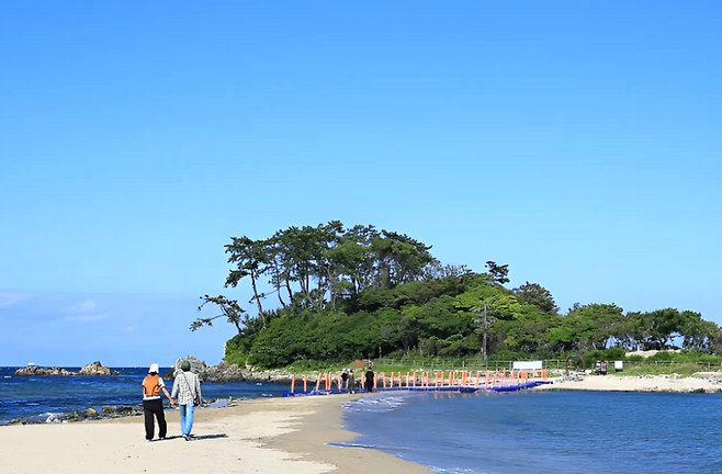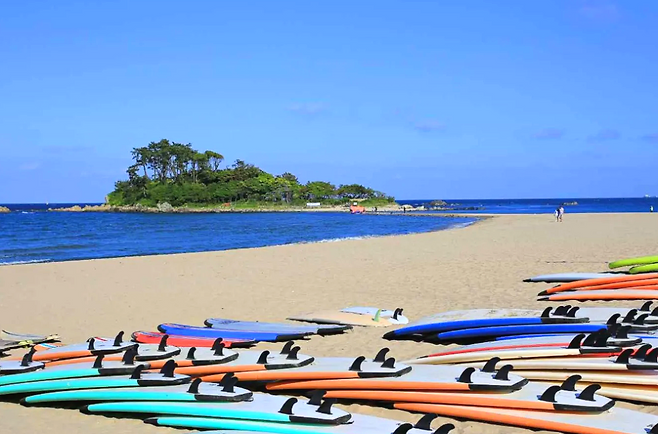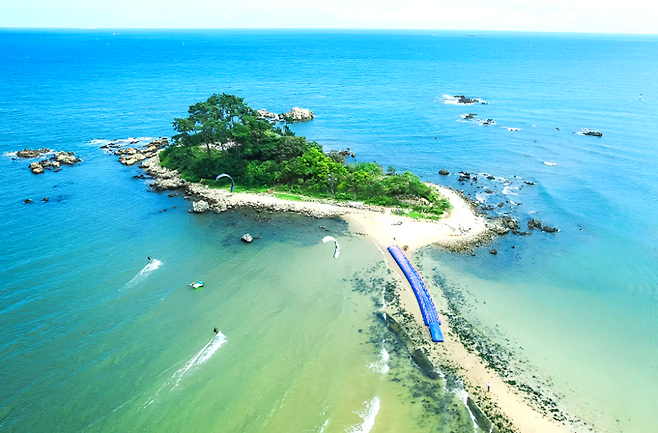 2km 길이의 백사장이 시원하게 펼쳐지고, 수심은 깊지 않아 어린아이도 안전하게 물놀이를 즐길 수 있는 곳. 바닷물의 온도도 적당해 부담 없이 몸을 담그기 좋고, 잔잔한 물결은 파도에 대한 두려움을 덜어줍니다.