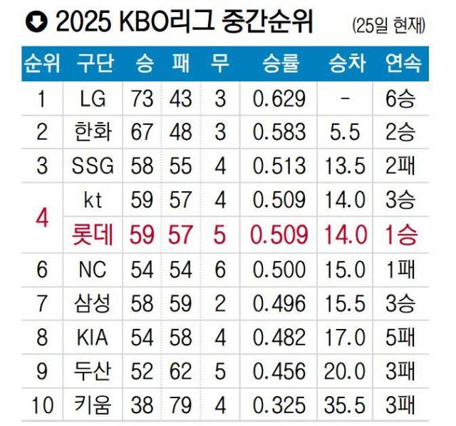 롯데는 이번 주 사직 6연전에 가을야구 진출 여부가 걸렸다. 사활을 걸어야 한다. 롯데는 26~28일 공동 4위인 kt와 3연전을 치른다. 4위를 따돌리고 3위 자리까지 돌아갈 절호의 기회다. 전반기를 3위(승률 0.547·47승 3무 39패)로 마친 롯데는 후반기에 승률 0.400(12승 2무 18패)으로 처지면서, 공동 4위로 내려앉았다. 반면 kt는 5위(승률 0.523·45승 3무 41패)로 반환점을 돌고, 후반기에 14승 1무 16패(승률 0.467)로 주춤했으나 중위권 대혼전 속에 공동 4위에 자리했다. 롯데는 올 시즌 맞대결에서 kt에 6승 2무 4패로 앞서 있다. 롯데는 이어 29~31일은 두산 베어스와 주말 3연전을 치른다. 두산은 현재 리그 9위로 처져 있지만, 롯데는 올 시즌 두산과의 상대전적에서 6승6패로 팽팽하게 맞서 있다.