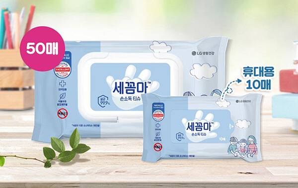 엘지생활건강의 ‘온더바디 세꼼마 손소독티슈’는 도톰한 원단을 적용해 언제 어디서나 편리하게 사용할 수 있는 티슈다. 향이 남지 않고 끈적임 없이 산뜻하게 사용할 수 있으며, 벤잘코늄염화물을 첨가하지 않았다. 포도상구균, 대장균, 녹농균, 바실러스, 살모넬라 등 5종의 유해균의 99.9% 살균 효과를 입증받은 제품이다. 휴대가 편한 소형 패키지와 캡형 패키지의 2종류를 고를 수 있다. 50매들이 캡형 3팩의 판매가는 19,040원이다.