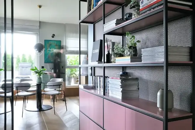 특히 책장 프레임이나 유리 파티션은 단단한 선을 강조하는 동시에, 빛을 흡수하고 반사하는 방식으로 섬세하게 다뤘다.