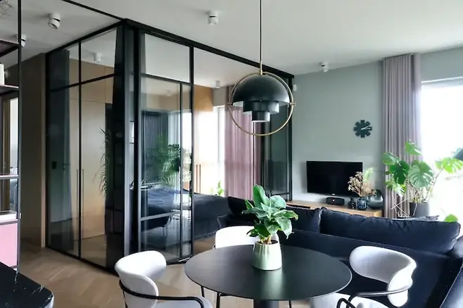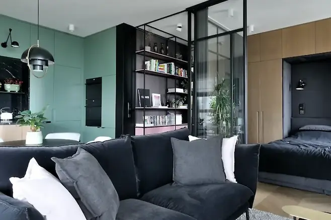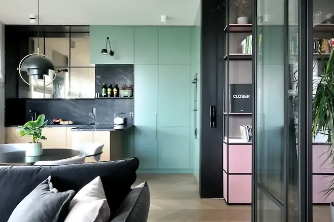 처음 이 집을 들여다봤을 때 가장 인상 깊은 건, 블랙을 이렇게까지 과감하게 사용할 수 있다는 용기였다. 블랙은 통상적으로 좁고 답답한 느낌을 줄 수 있지만, 실내 전체의 메인 컬러를 블랙으로 설정하면서도 민트 그린으로 균형을 잡아 무게감을 덜었다.