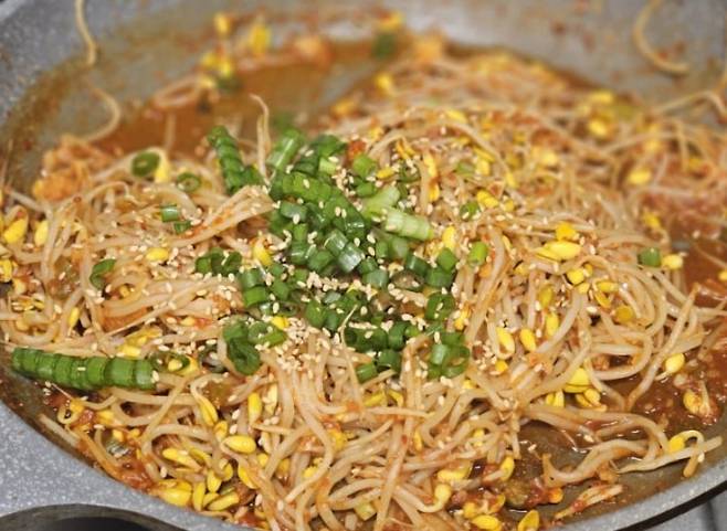 콩나물을 미리 삶지 않고 바로 볶는 방식이라 아삭아삭 식감은 살아있고,