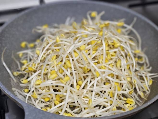 1. 콩나물을 깨끗이 씻은뒤에 후라이팬에 넣고, 물을 한컵 넣어주세요. 국물이 자작하게 있는걸 좋아하면 물을 반컵 더 넣어주세요.
