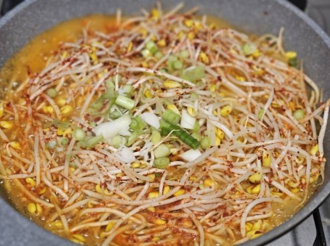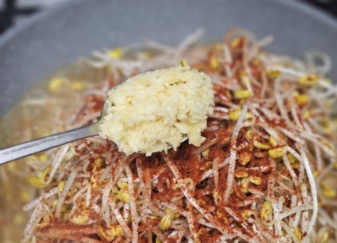 2. 고춧가루와 다진마늘을 넣고, 센불에서 끓여주세요. 뚜껑은 열어둔채로 조리할께요. 콩나물을 뒤적거리면 비린내가 날 수 있기 때문에 익을 때까지 섞지 마세요.