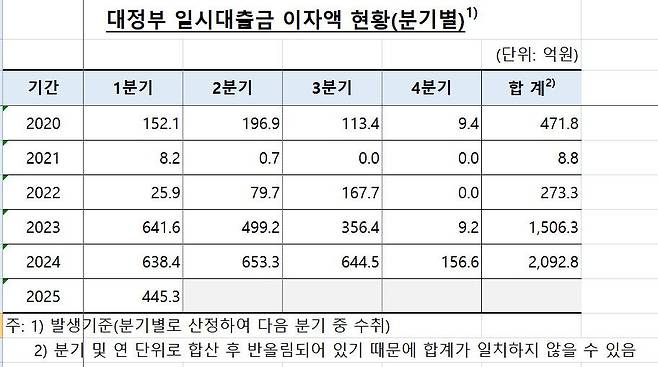 이 기준에 따라 올해 1분기 발생한 일시대출 이자만 총 445억3천만원으로 집계됐다. 지난해 정부는 2천92억8천만원에 이르는 일시대출 이자를 한은에 지급했다.