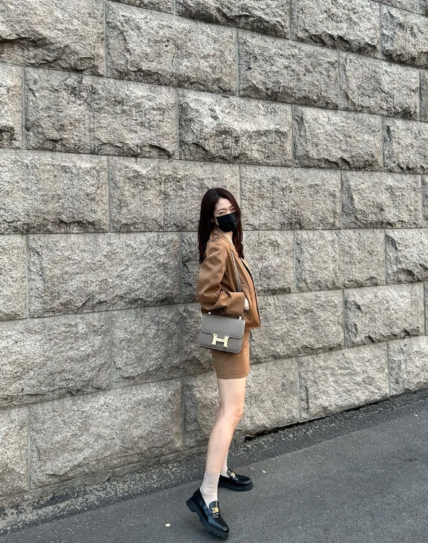 가방은 에르메스 콘스탄스로, 스트랩형 디자인 덕분에 데일리 활용도가 높다.
