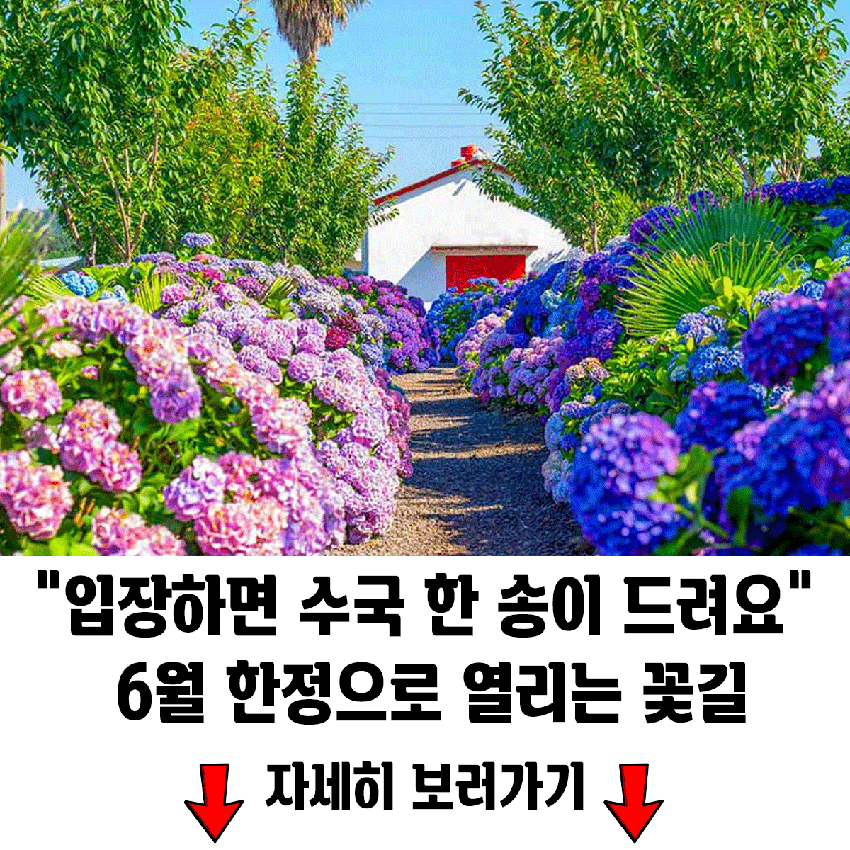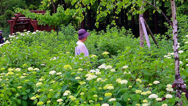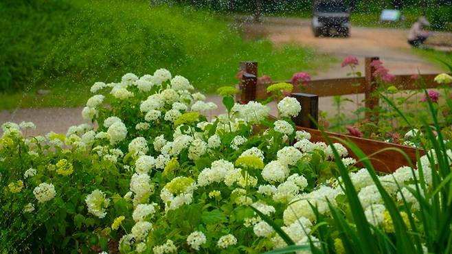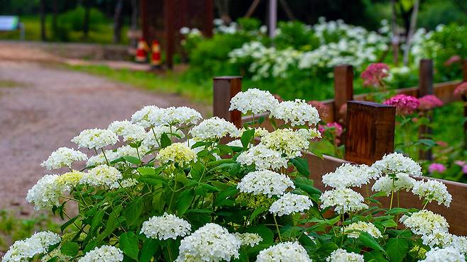 특히 ‘수국원’이라 불리는 테마 정원에서는 푸른빛, 연보라, 분홍빛의 수국이 한데 어우러져 형형색색 장관을 연출한다.