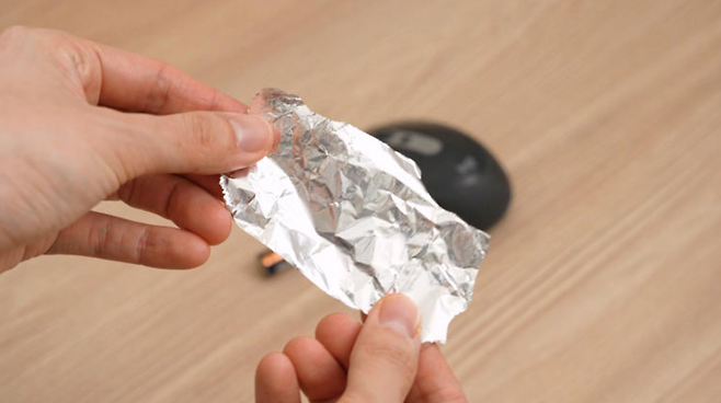 이럴 때는 알루미늄 호일을 이용하세요.호일을 작게 말아 공처럼 만든 뒤, 건전지 슬롯의 빈 공간에 끼워 넣으면 전류가 연결돼요.