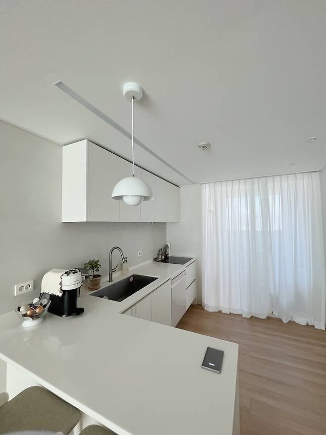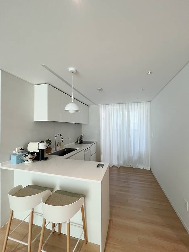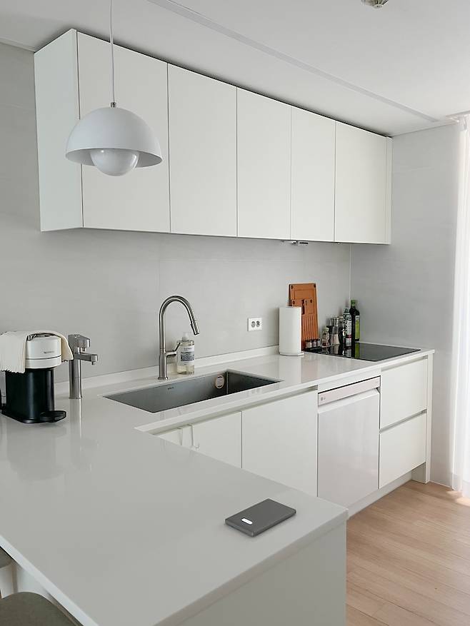 결국엔 ㄱ자 주방을 선택했는데 지금까지도 대만족하고 있어요. 둘이서 같이 아일랜드 식탁에서 밥을 잘 먹진 않지만 재택근무를 많이 하는 저는 주로 집에서 밥을 먹는데, 혼자서 먹기엔 이 공간이 너무 딱 유용하거든요 !!