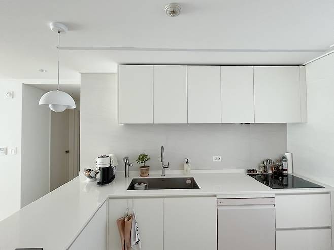 ㄱ자 쪽 상부장은 비워뒀어요. 거기까지 꽉- 채우면 너무 답답할 것 같기도 하고, 아일랜드 식탁 쪽에 상부장이 있으면 머리가 부딪힐 염려도 있어서요! 초반에는 그렇게 비워진 상부장 부분에 선반을 달기로 했었어요. 인테리어 사장님도 당연히 그렇게 진행할 거라고 생각하신 듯하고요-