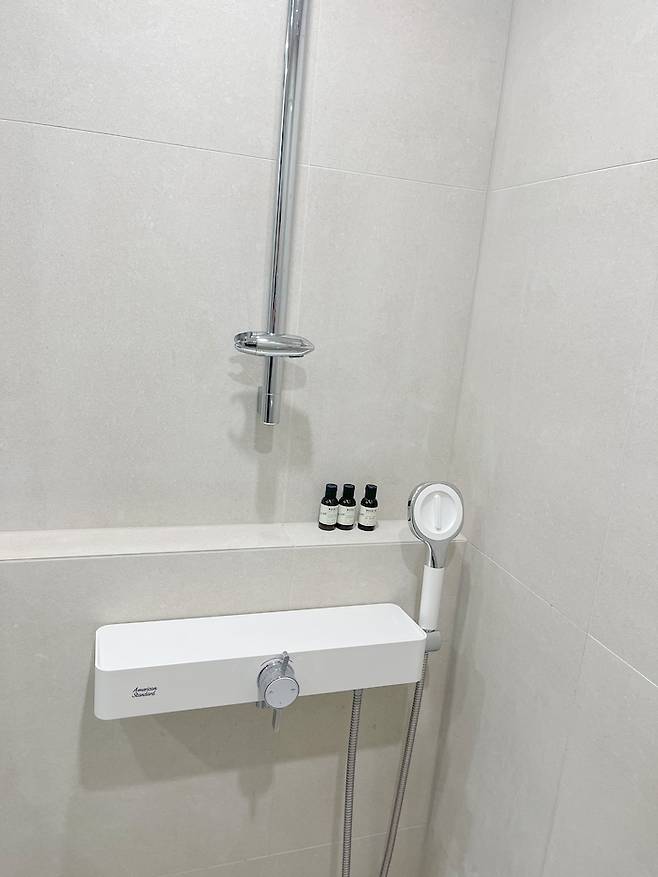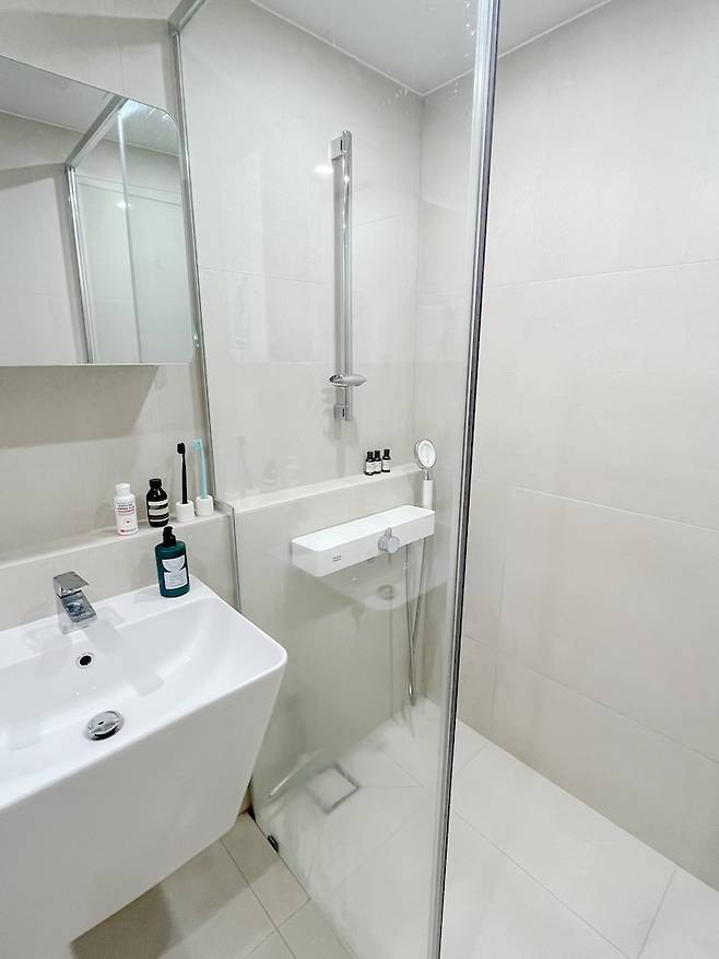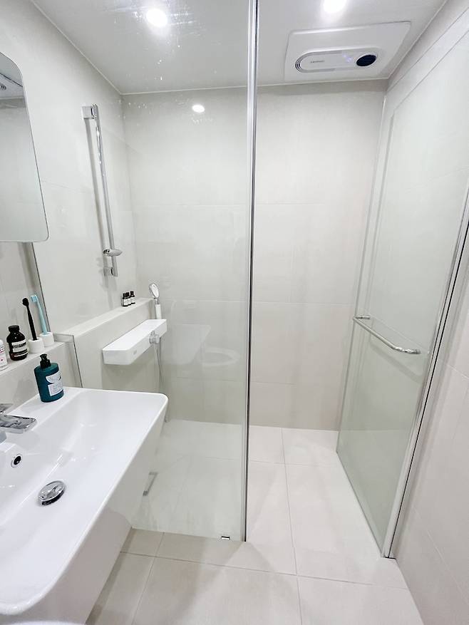 또 크게 달라진 부분으로는 욕조를 철거하고 샤워부스를 만들었다는 점이에요. 제가 친정에서 욕조 있는 집에서 살아보니까, 반신욕이 취미가 아닌 이상 욕조 활용도가 너무 적더라구요. 샤워할 때마다 욕조 안으로 들어가는 것도 뭔가 번거롭구요..! 그래서 이 집에선 꼭 욕조를 철거하고 샤워부스를 하기로 마음먹었어요!