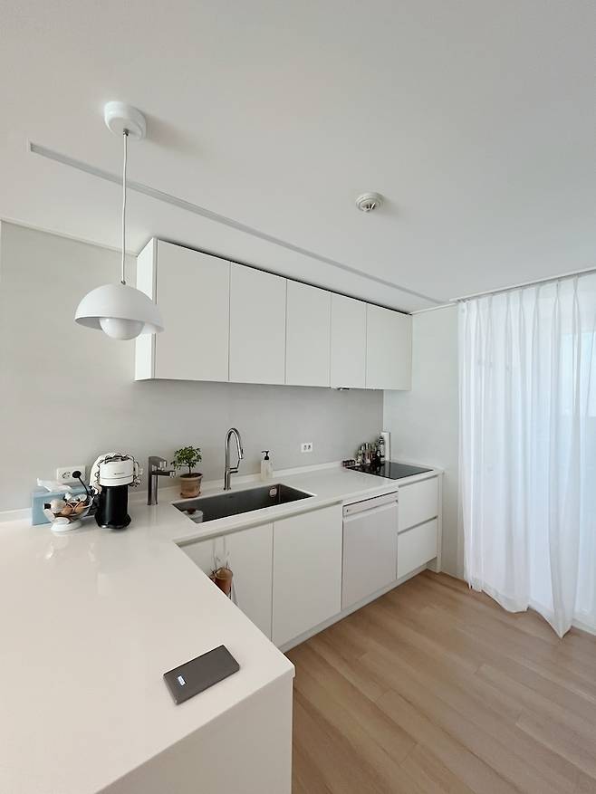 여기는 주방입니다! 구조에 있어서 가장 많은 고민을 했던 공간이에요. 베란다 확장을 해서 아예 주방의 개방감을 확 열어줄까 했는데, 이 부분은 정말.. 안한 걸 잘했다고 생각해요.