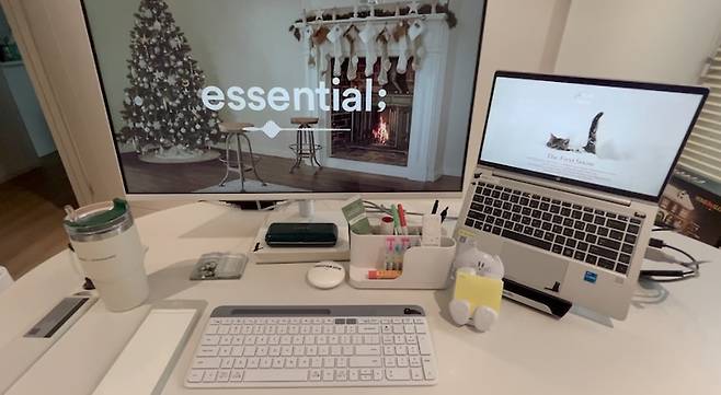 앞모습을 보면 요렇게 화이트 화이트한 제 재택 공간이 나옵니다 :-> 모니터 진짜 크죠... ㅎㅎ 모니터는 삼성 스마트 모니터인데 넷플릭스/유튜브/디즈니 다 가능해서 주말엔 안방으로 가져가서 드라마를 보기도 해요! 삼탠바이미 거치대는 안 샀지만, 바체어 위에 올려두고 간이 삼탠바이미도 만들 수 있어서 좋더라구요 -