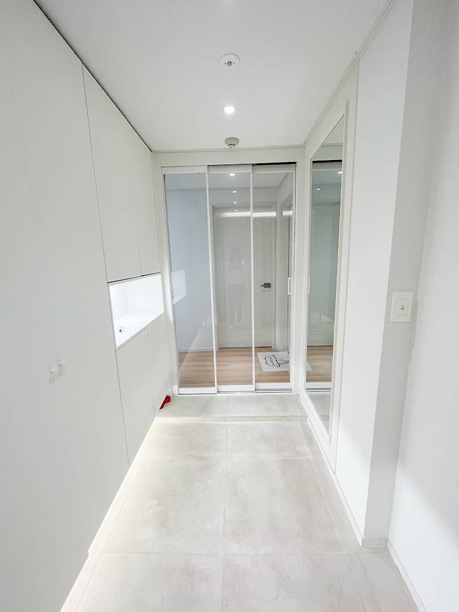 전실은 전체 수납장을 짜 넣어서 수납을 최대화했어요. 그리고 요즘 필수템인 중문도 장착해 주었답니다! 중문의 경우엔 디자인을 본다면 스윙도어를 하는 게 맞았는데요..!