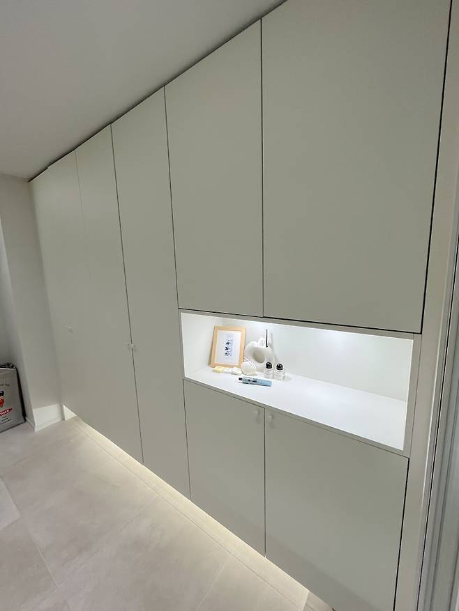 장 짜둔 부분 중에 두 개는 이렇게 터서 오브제나 향수, 차 키 등을 올려두고 편하게 사용하고 있어요. 나가기 전에 향수도 뿌리고 옷매무새도 다듬는 공간이에요 :)