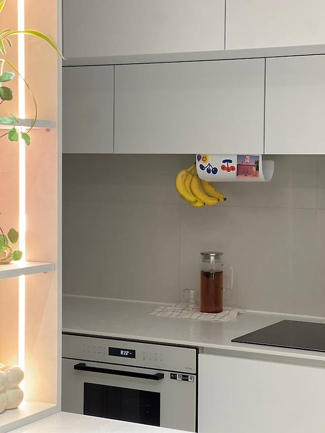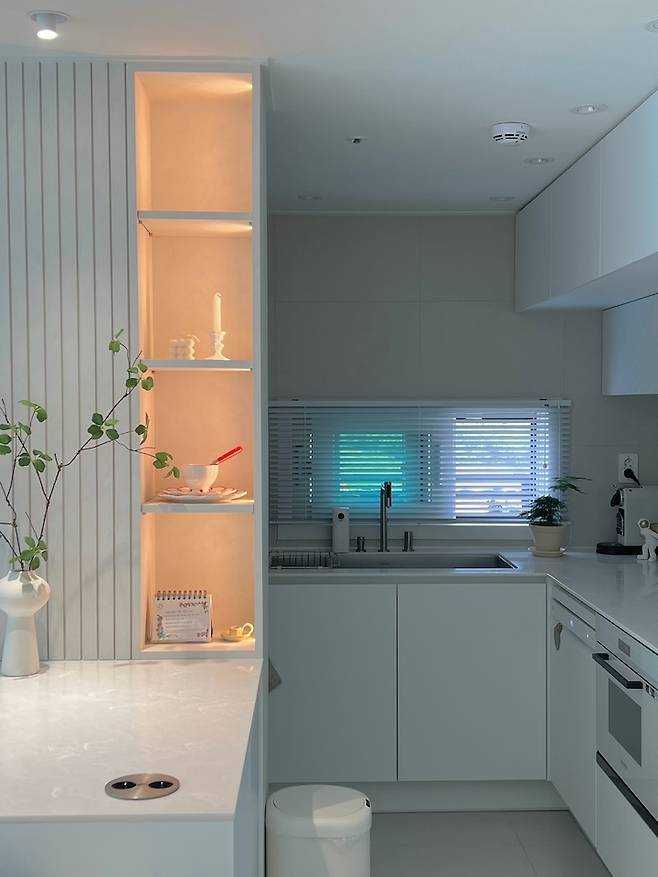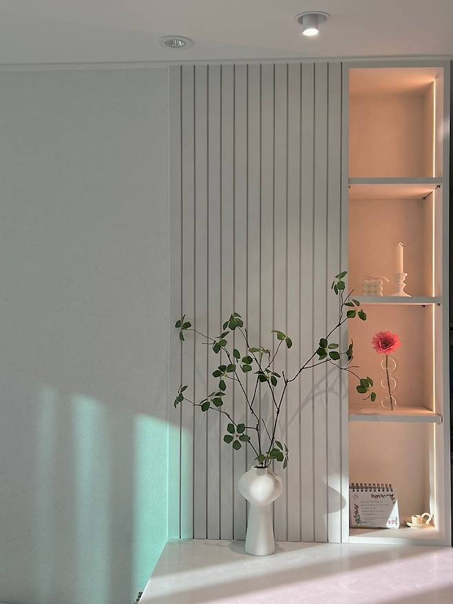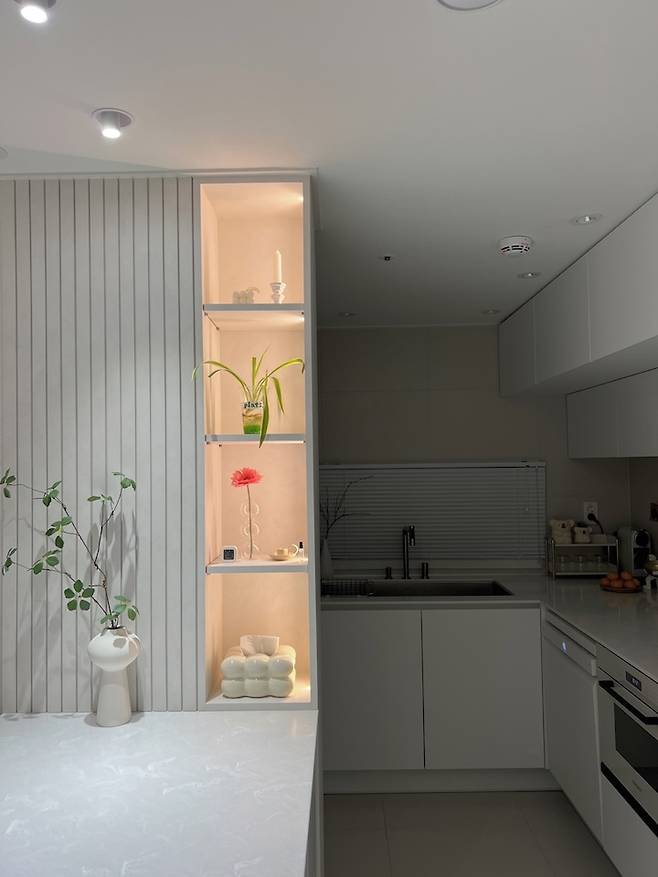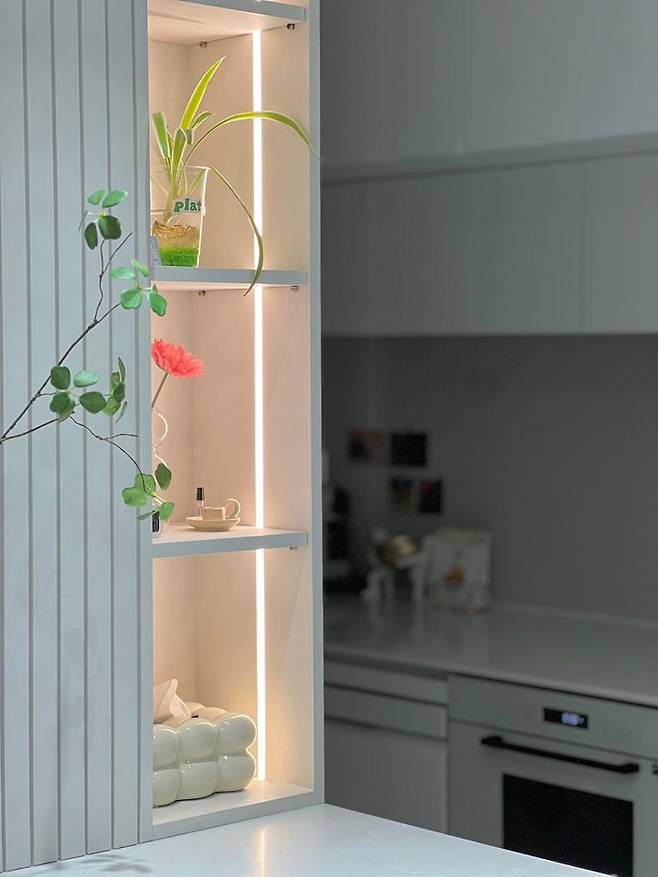 장식장에는 라인 조명을 설치했는데 조명을 켜면 더 예쁜 공간이 되는 거 같아요. 가끔 오브제나 소품들도 바꿔가면서 올려두면 기분 전환도 되고, 집에 오시는 분들마다 꼭 한번씩 물어보기도 하고 예쁘다고 감탄하는 공간이랍니다.