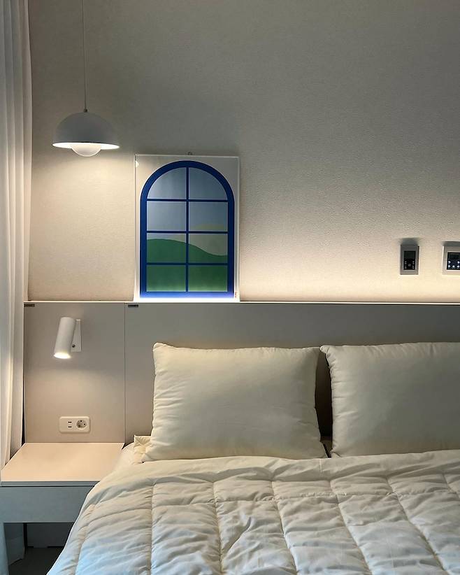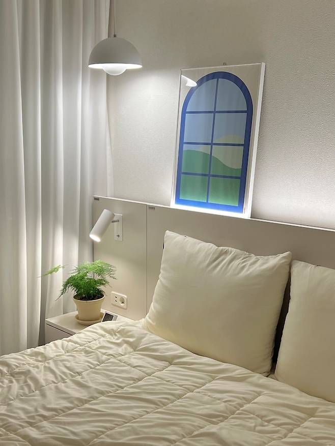 침대 위에는 포스터 액자를 올려두었는데 가끔 다른 그림의 액자를 바꿔서 올려두면 기분전환도 되고 참 좋더라구요.