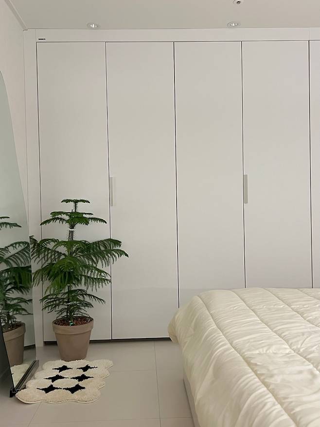 침대 맞은편에는 붙박이장을 설치했고 옆에는 170 사이즈의 대형 전신거울을 두었어요. 안방에는 파우더룸과 화장대는 시공 하지 않았어요. 전신거울 앞에서 간단한 메이크업을 하기도 해요. 파우더룸과 화장대가 없어서 공간 활용을 넓게 쓸 수 있어서 좋은 거 같아요.