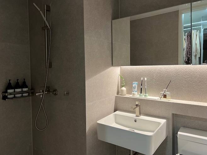 안방 화장실과 색상은 다르지만 거친 질감과 요철이 있는 600각 포세린 타일로 골랐답니다. 화장실에 물기가 있어도 덜 위험하더라구요. 화장실 욕실도 600각에 졸리컷 시공을 했어요. 젠다이도 시공해서 칫솔과 핸드워시 디스펜서를 올려두고 사용 중이에요.