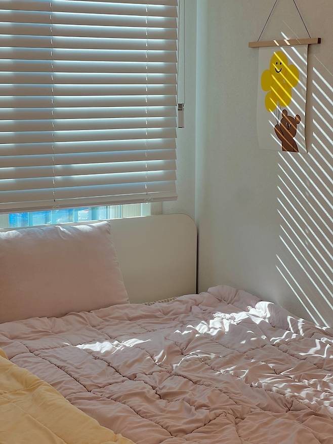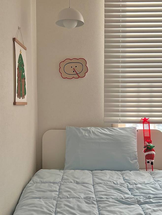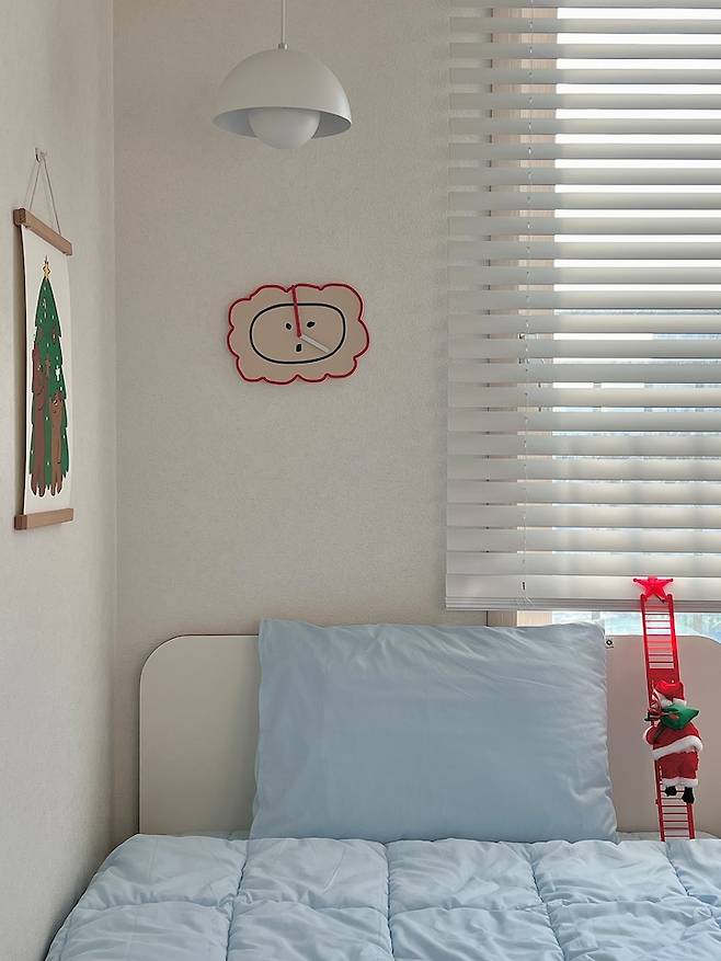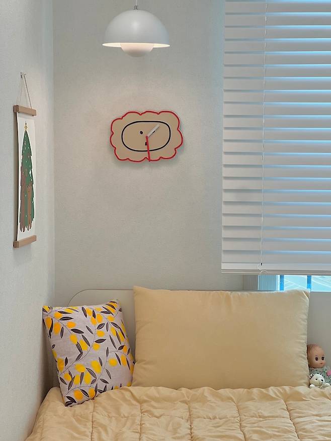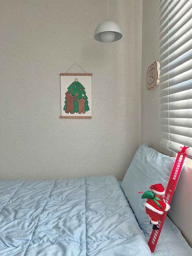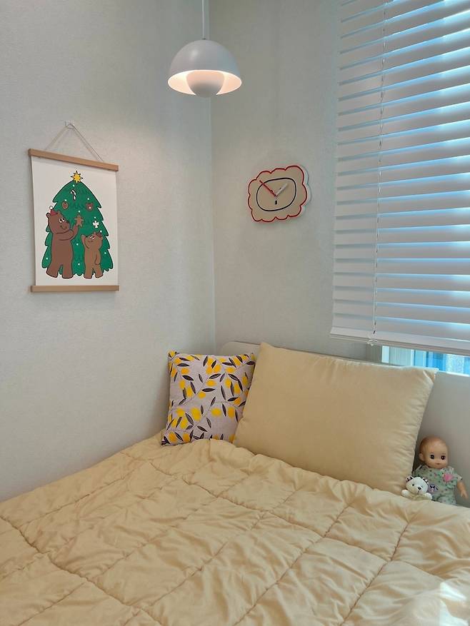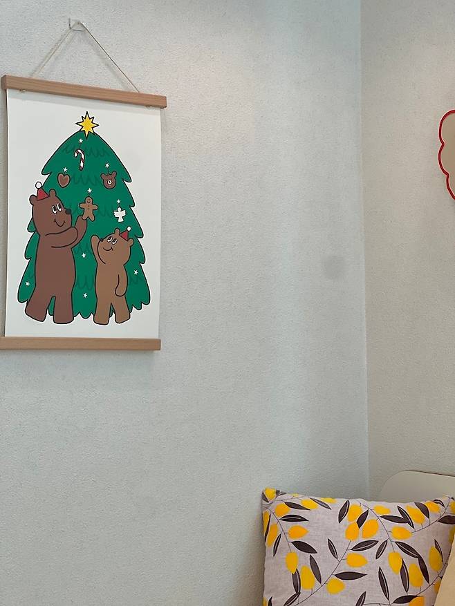 침실 벽면 쪽에는 귀여운 포스터를 걸어두었어요. 계절마다 포스터를 바꿔주고 있는데 분위기 전환에도 좋고 아이들도 정말 좋아한답니다.