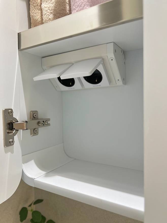 욕실 수납장 안에는 코너 콘센트를 매립해달라고 요청드렸어요. 평소에 구강세정기 충전도 해놓고 욕실에서 머리를 말릴 때도 유용하게 잘 사용하고 있어요.