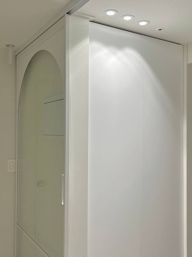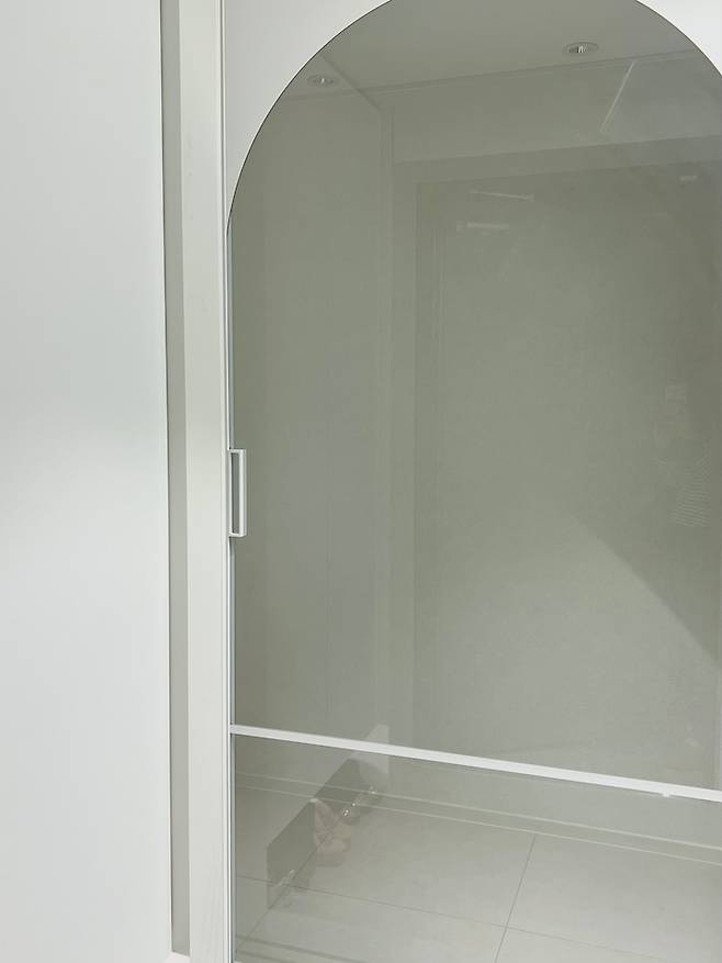입주하면 중문은 무조건 설치하려고 생각했었어요. 저희는 아치형 통유리로 된 원슬라이딩 중문을 설치했어요. 통유리라서 개방감도 좋고 깔끔해서 좋아요. 단점은 지문이 잘 묻기 때문에 청소와 관리를 잘해야 하지만 정말 맘에 드는 중문이랍니다.