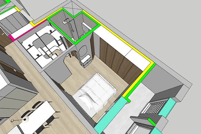 마옵 계약을 하고 인테리어 업체와 몇달 동안 계속해서 미팅하고 수정해서 결정된 저희 집 3D 도면이에요. 실제 인테리어가 완성되고 나서 3D레이아웃과 정말 똑같아서 너무 신기했어요.