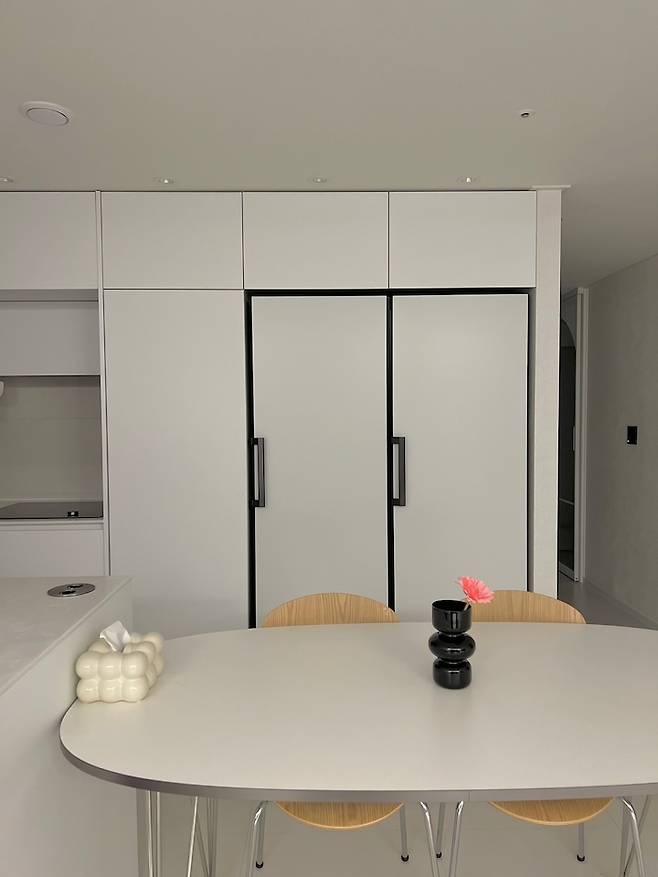좁은 주방을 더 넓게 쓰는 방법을 고민하다가 저희 대표님과 팀장님이 거실벽 쪽에 가벽을 더 넓게 세우고 아일랜드 식탁을 제작해서 주방과 거실을 넓게 사용하는 방법을 제안해주셨어요. 거실 벽쪽에 가벽을 세우는 방법은 생각지도 못한 방법이었는데 대표님과 팀장님 덕분에 거실과 주방을 더 넓게 사용할 수 있게 되었답니다.