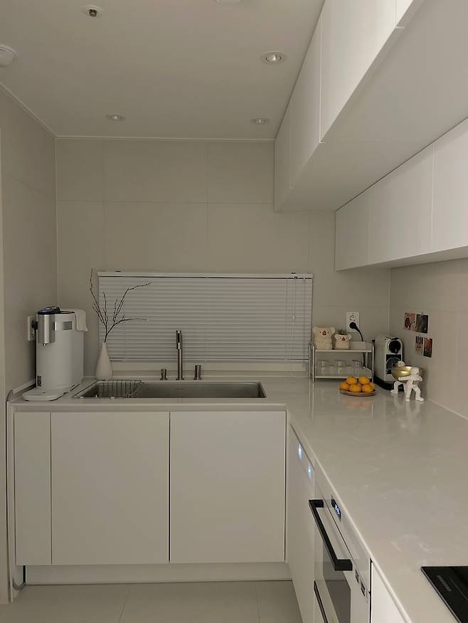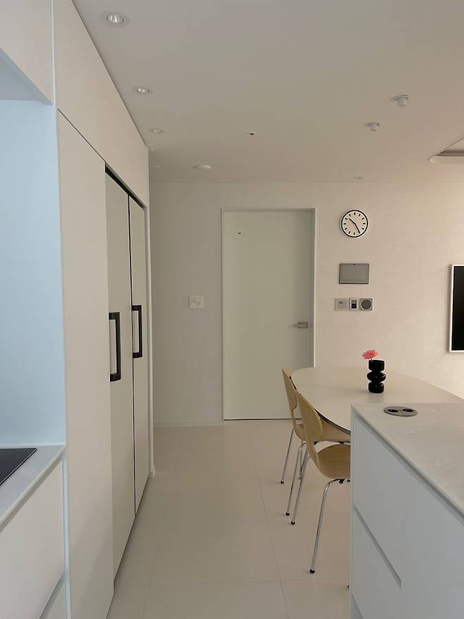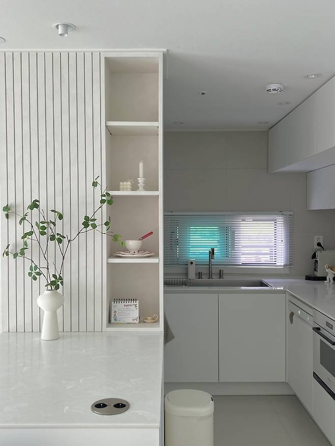 평수가 조금만 더 넓었다면 제 로망인 대면형 구조의 주방을 꼭 시공하고 싶었는데 아쉽게도 대면형 주방은 포기할 수 밖에 없었어요. 나중에 30~40평대로 이사를 가게 된다면 대면형 주방으로 꼭 시공해 보고 싶어요.
