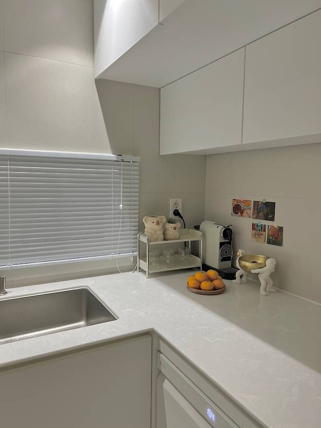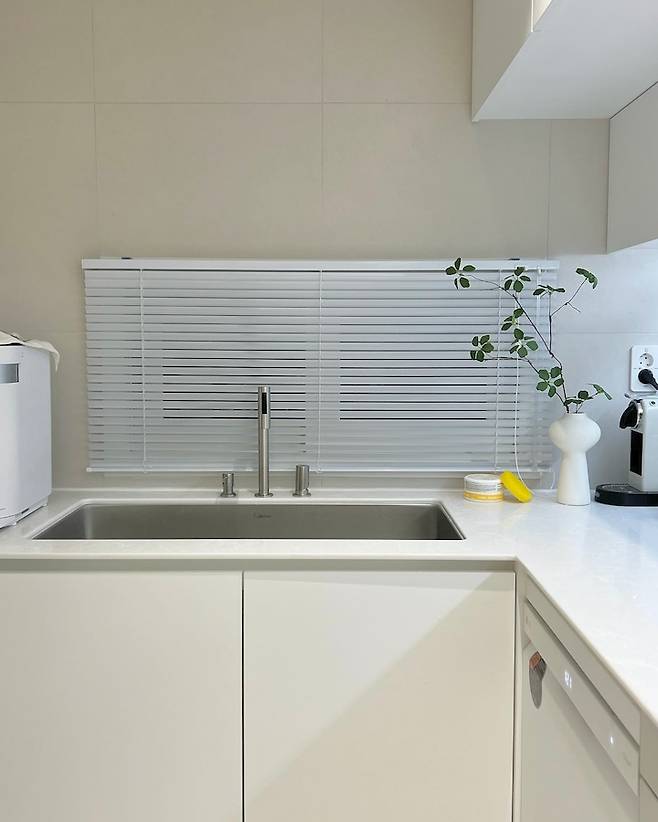 저희 집 주방은 남서향이라서 오후 2시~5시 이후까지 해가 정말 잘 들어와요. 주방 창에는 알루미늄 블라인드를 설치했어요. 해가 쨍하게 들어올 때 블라인드를 내리면 아늑한 카페 분위기도 나고 정말 맘에 들어요.