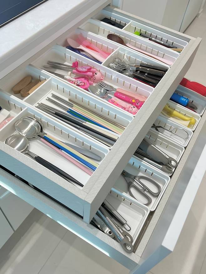 이너 서랍을 제작해서 윗칸에는 수저, 아래칸에는 조리도구를 정리했는데 깔끔하게 정리도 되고 수납도 잘 되서 정말 만족스러워요.