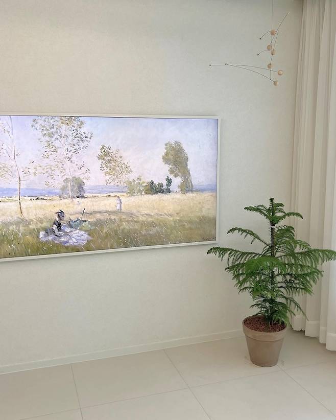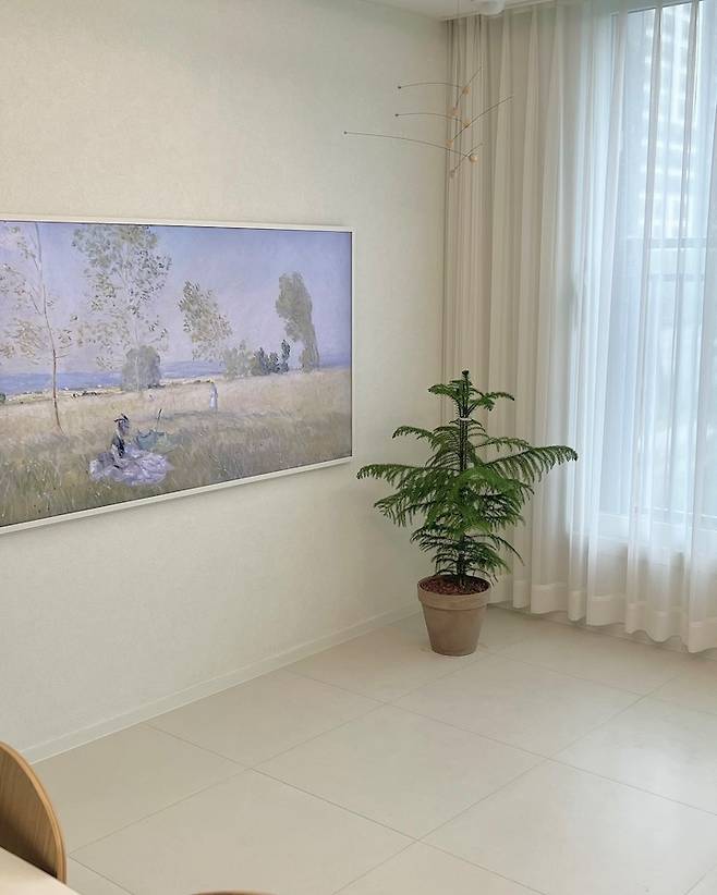 다음에 조금 더 큰 평수로 이사를 가게 된다면 거실을 서재로 시공해 보고 싶어요. TV는 이번에 이사 오면서 구매한 삼성 더프레임 TV 65인치에요. 저희 집 평수에 TV 크기가 잘 맞는 거 같아요. 무엇보다, 액자 그림을 언제든지 바꿀 수 있어서 정말 맘에 들어요.