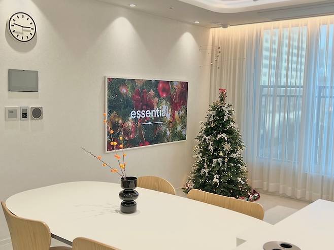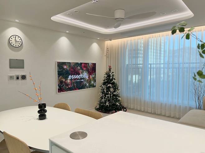 저희 인테리어 대표님과 팀장님께서 하나하나 신경 써주신 덕분에 TV가 정말 액자처럼 깔끔하게 설치 되었답니다. 공유기와 셋탑박스도 쇼파 뒤쪽으로 숨겨 두었더니 눈에 보이지 않아서 깔끔하고 정리가 잘 되서 좋아요.