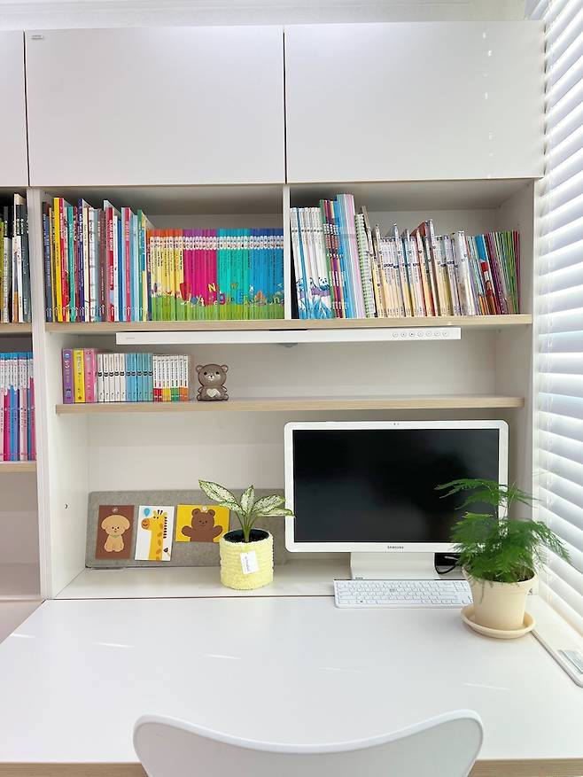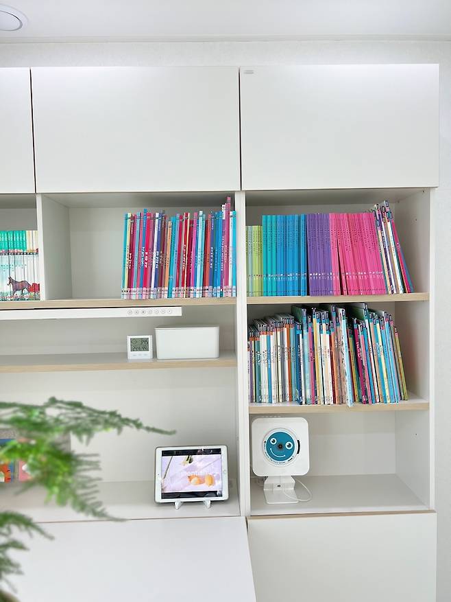 공부방 입구쪽에는 미니 책장이 있어요. 8살이지만 아직도 너무 좋아하는 추피책이랍니다. 미니책장에 앉아서 추피책 읽는 걸 정말 좋아한답니다.