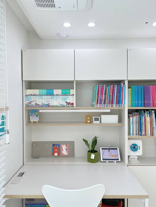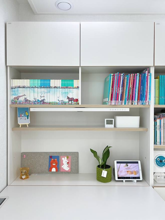 올해 초등학교 입학하는 첫째를 위해 책상을 두었어요. 공간을 넓게 쓰기 위해 책상을 하나만 둘까 생각도 했었는데 책 수납과 장난감 수납을 위해 책상 세트를 두 개 구매했어요.