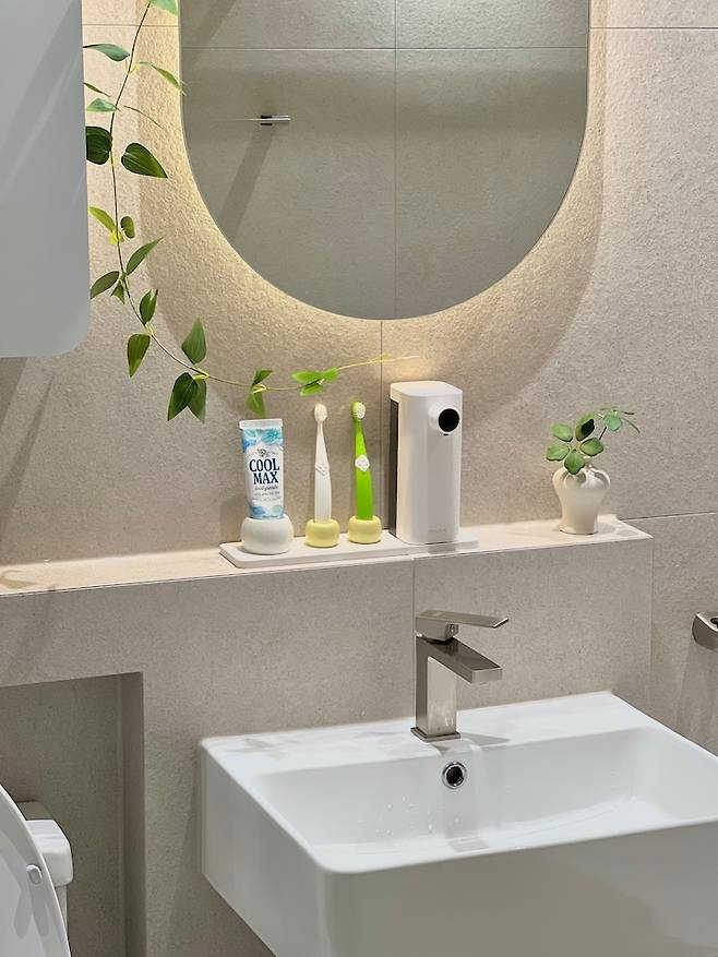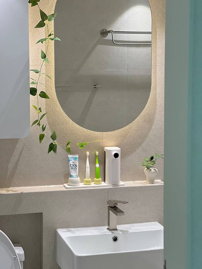 세면대 위에는 핸드워시 디스팬서를 올려두었는데 아이들이 사용하기에도 편리하고 정말 추천 드려요.