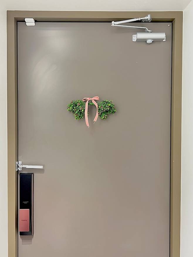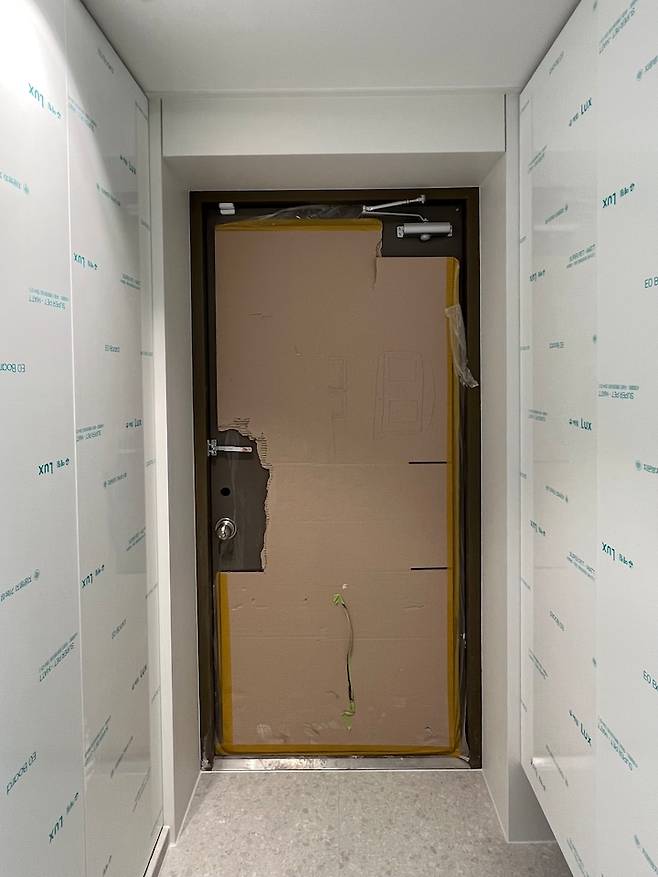 현관 방화문 필름은 재시공하지 않고 그대로 사용하기로 했어요. 도어락은 삼성 SHP-DP951 제품으로 설치했는데 지문인식 기능이 있어서 정말 편리하게 사용하고 있어요.