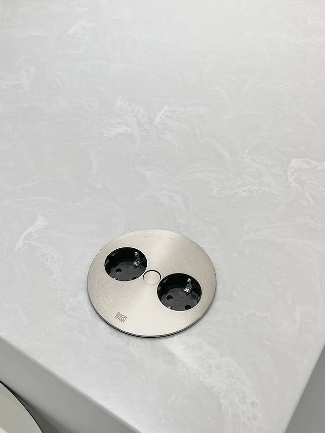 주방 인테리어 시공 팁으로, 아일랜드 상판에 '바흐만 트위스트 빌트인 매립콘센트'를 설치했어요. 다른 매립 콘센트 보다 가격대는 높지만 무광이라 정말 예쁘기도 하고 평소에 휴대폰 충전도 하고 진공 블렌더를 사용할 때도 유용하게 잘 사용하고 있어요. 상판 매립 콘센트는 꼭 추천드려요.