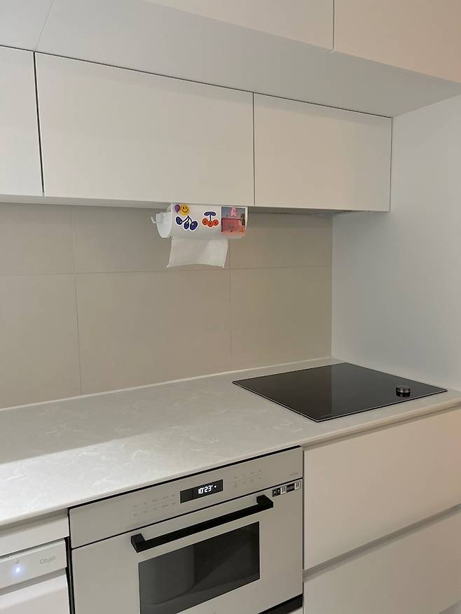 인덕션과 빌트인 오븐, 식세기도 딱 맞게 가구를 제작해서 설치했어요. 일반적인 아파트 주방 상판보다 넓어서 요리하기에도 정말 편하고 좋아요.