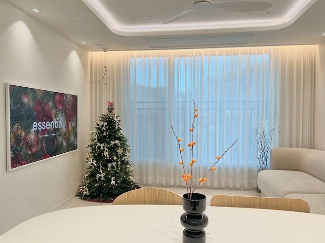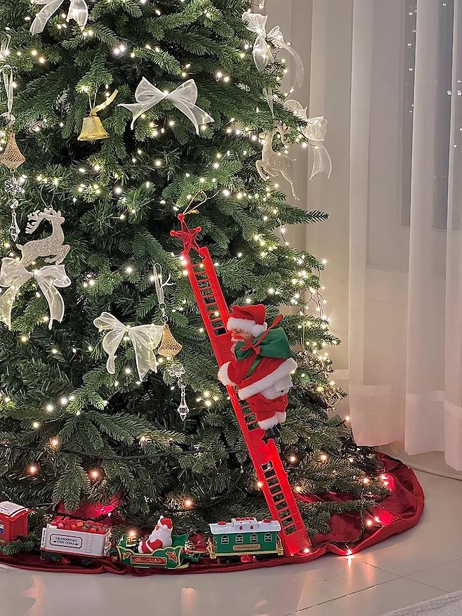 작년까지 사용했던 크리스마스 트리가 180cm이었는데 크기가 커서 처분하고 올해는 150 사이즈로 구매했어요. 아담한 저희 집에 정말 잘 어울리더라구요. 예쁜 오너먼트도 달아주고 펄화이트 리본을 주문해서 트리에 달아줬더니 정말 예쁜 거 같아요.