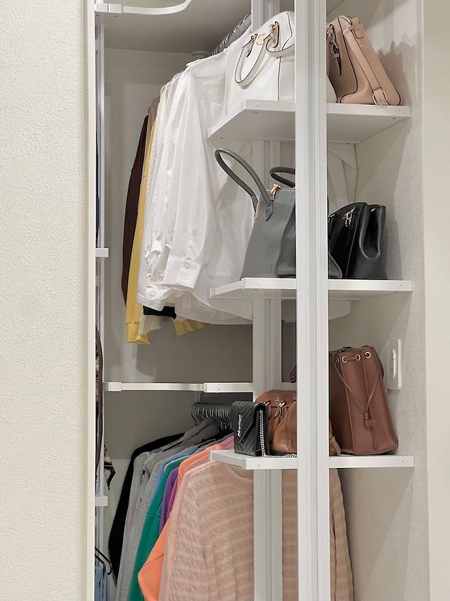 드레스룸에는 색깔별로 옷을 정리해서 걸어뒀고 선반에는 가방을 정리해두었어요.