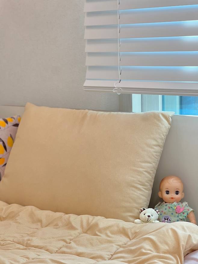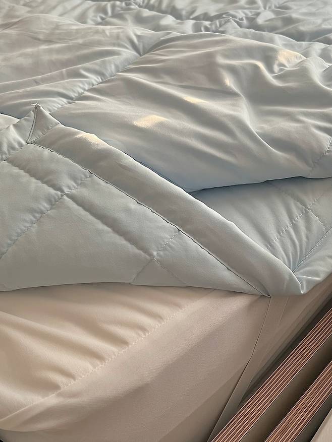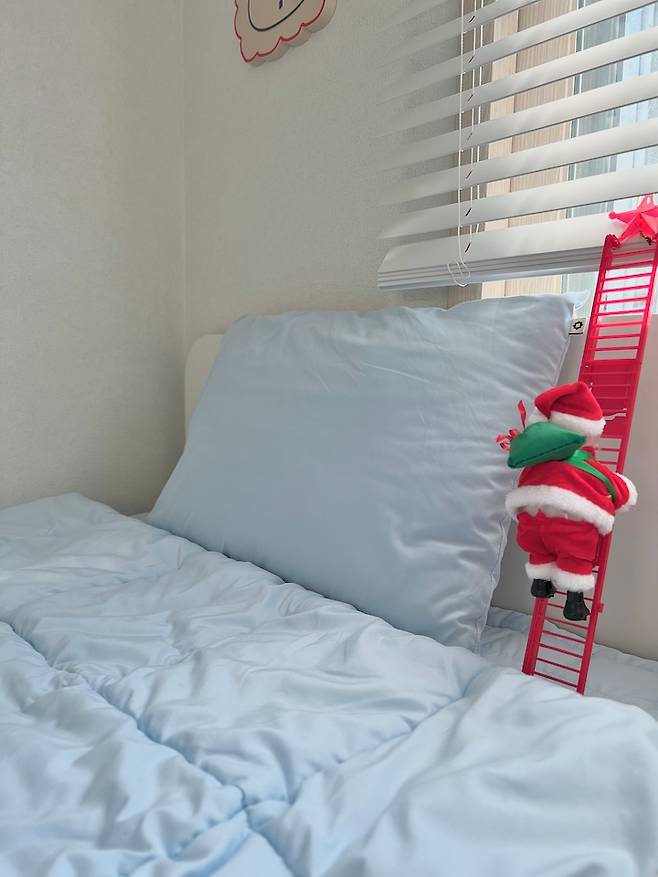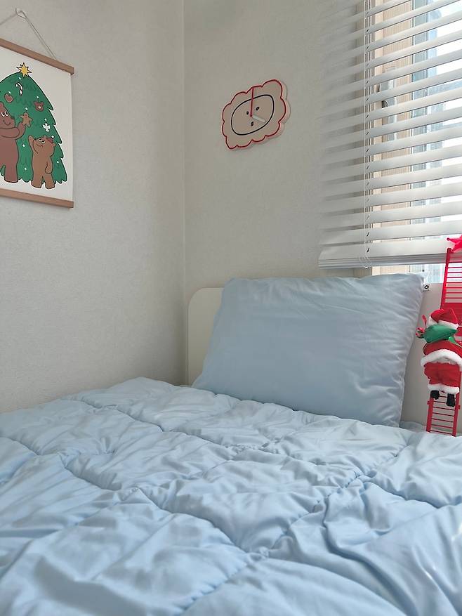 얼마 전 하늘색 새 침구로 교체를 해봤어요. 하늘색이라서 추워 보일까 했는데 색상이 정말 예쁘더라구요.