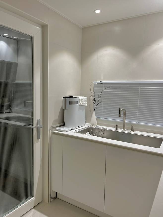 주방 한쪽에는 자주 사용하는 물컵과 네스프레소 커피머신을 두었어요. 주방 바로 옆에는 세탁실이 있어요. 세탁실 문은 터닝도어로 설치했어요. 터닝도어가 금액대는 높지만, 소음과 냉기차단이 잘 되서 만족스러워요.