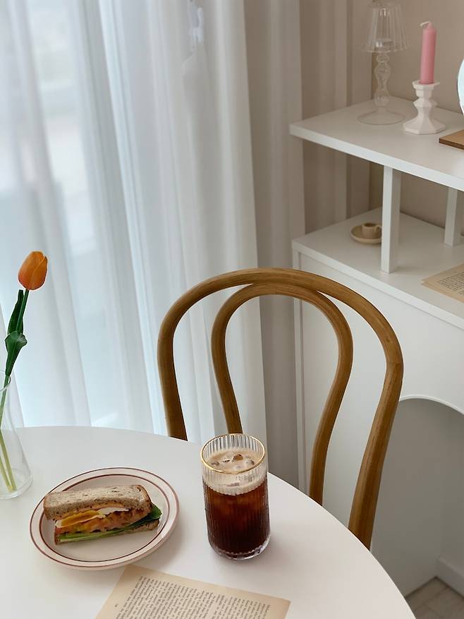 화이트 인테리어지만 단조롭지 않게 가구와 소품으로 최대한 톤온톤을 맞추려고 했어요.